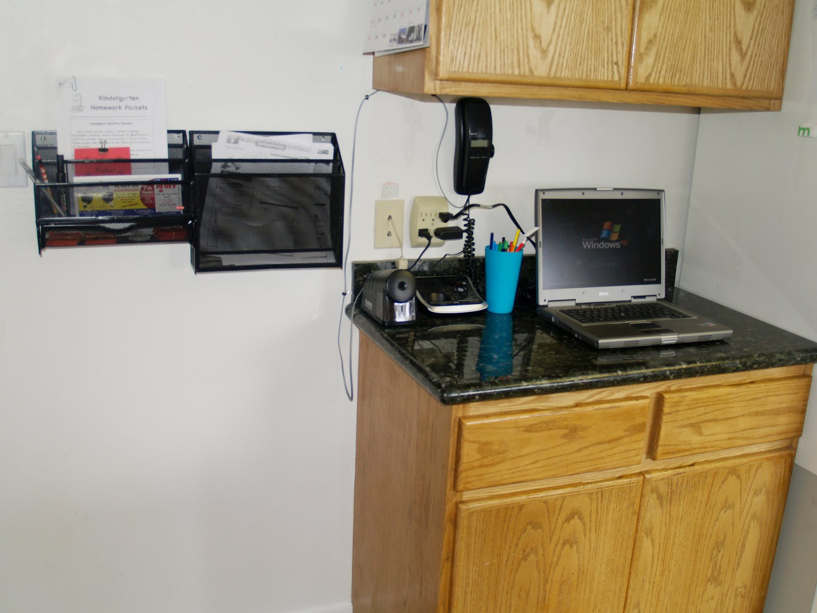 In Extreme Makeover Home Edition style, I renovated this junky section of my kitchen into a standing writing area. Please notice the laptop, cup-a-pencils, and commercial-strength pencil sharpener. I haven’t done any writing here yet, but the desk has stayed clean for six days – a Warner record. Home organization people recommend getting stuff off the counter tops. I hung the wire file organizers on the wall and, miraculously, the kids now put school papers in them. Amazing. One small step for a writer, one giant leap for motherhood.
