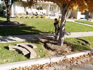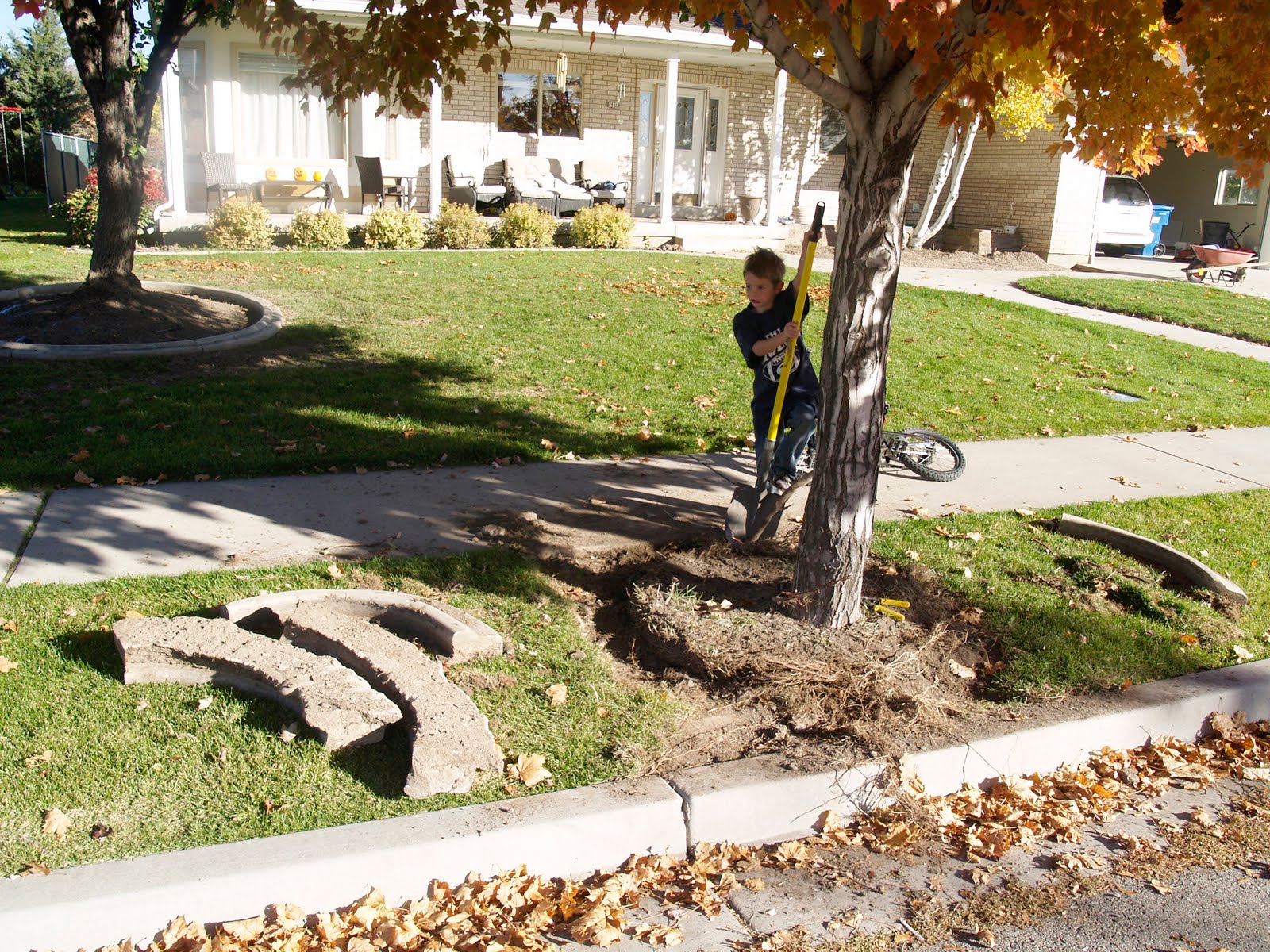 As you can see, I wasn’t kidding about digging up segments of our yard. I pried up cement trim, took out dirt, and put weed barrier in the flower beds. This is the “before” picture. Next spring I hope there will be beautiful, tulip-filled and weed-free “after” pictures to post.